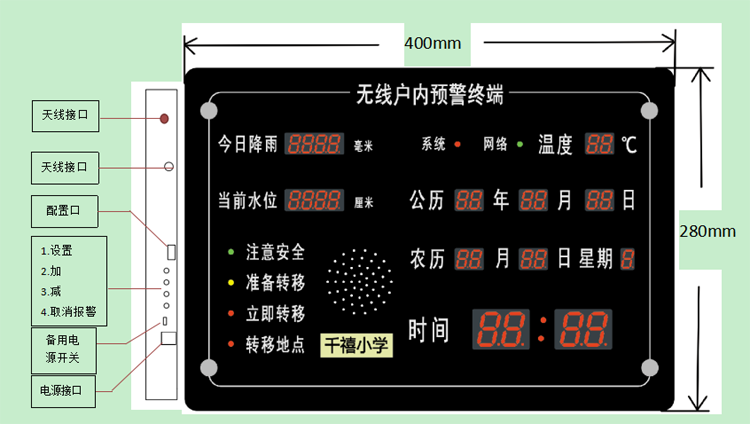 產(chǎn)品采用與家庭日常用品相結(jié)合的親民形式,具有公歷、農(nóng)歷、時間、星期、溫度等居民日常常用信息的顯示功能,可提高居民對設(shè)備維護的重視程度,便于居民及時掌握預警信息。